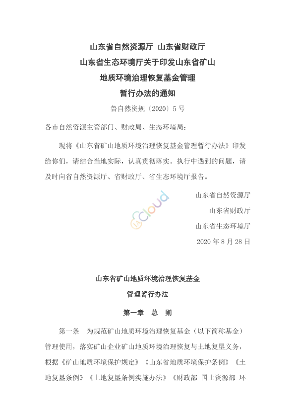 各市自然资源主管部门、财政局、生态环境局: 现将《山东省矿山地质环境治理恢复基金管理暂行办法》印发给你们,请结合当地实际,认真贯彻落实。执行中遇到的问题,请及时向省自然资源厅、省财政厅、省生态环境厅报告。