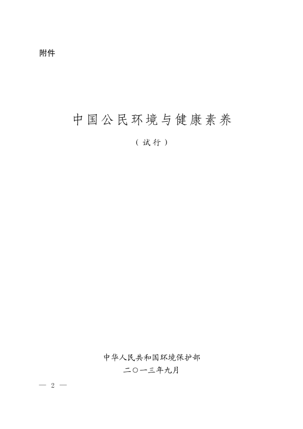 关于发布《中国公民环境与健康素养(试行)》的公告 根据《国家环境与健康行动计划》(2007-2015),为界定我国公民环境与健康素养基本内容,普及现阶段公民应具备的环境与健康基本理念、知识和技能,促进社会共同推进国家环境与健康工作,我部委托中国环境科学学会,组织有关专家编制了《中国公民环境与健康素养(试行)》,现予发布。 特此公告。 附件:中国公民环境与健康素养(试行) 环境保护部 2013年9月29日