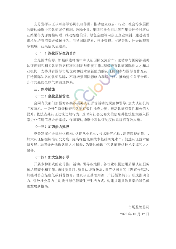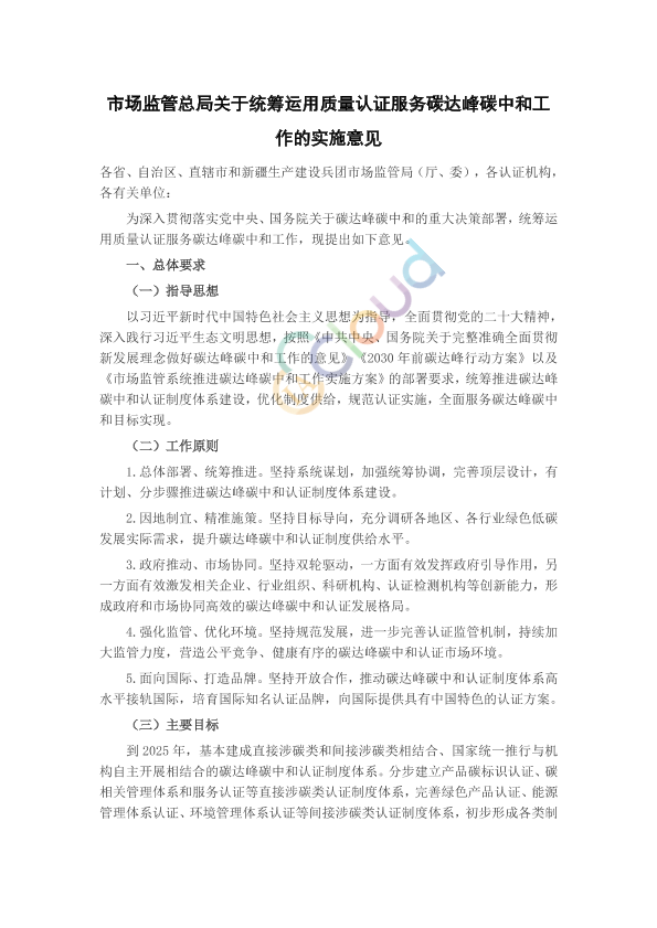 各省、自治区、直辖市和新疆生产建设兵团市场监管局(厅、委),各认证机构,各有关单位: 为深入贯彻落实党中央、国务院关于碳达峰碳中和的重大决策部署,统筹运用质量认证服务碳达峰碳中和工作,现提出如下意见。