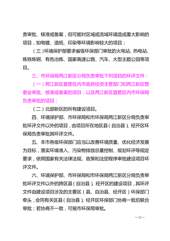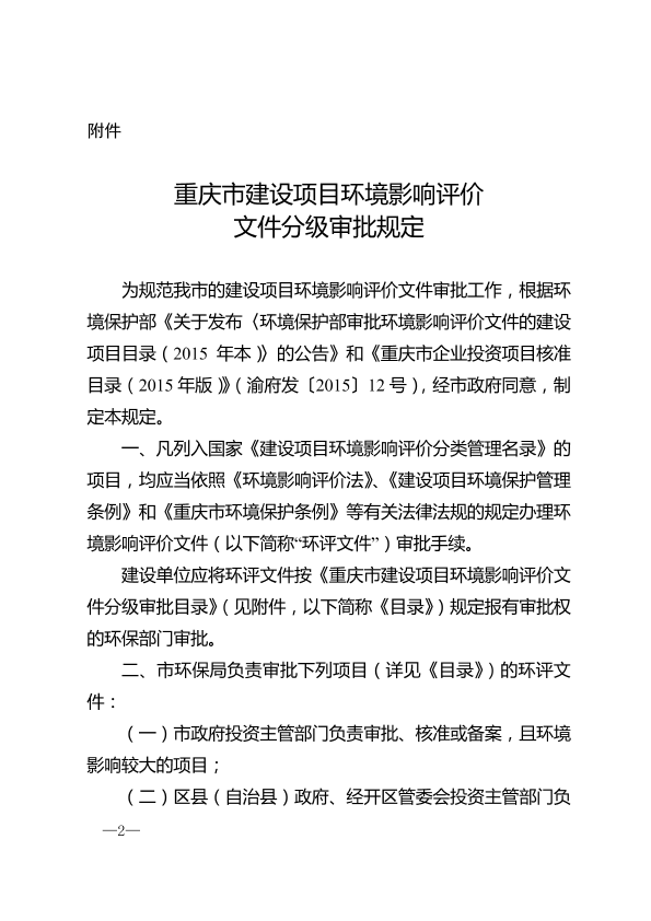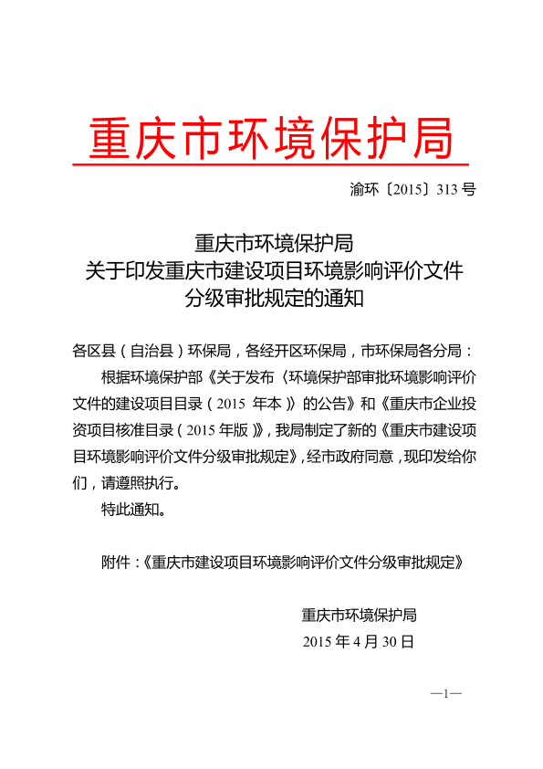 各区县(自治县)环保局,各经开区环保局,市环保局各分局: 根据环境保护部《关于发布〈环境保护部审批环境影响评价文件的建设项目目录(2015年本)的公告》和《重庆市企业投资项目核准目录(2015年版)》,我局制定了新的《重庆市建设项目环境影响评价文件分级审批规定》,经市政府同意,现印发给你们,请遵照执行。 特此通知。 附件:《重庆市建设项目环境影响评价文件分级审批规定》 重庆市环境保护局 2015 年4月30日