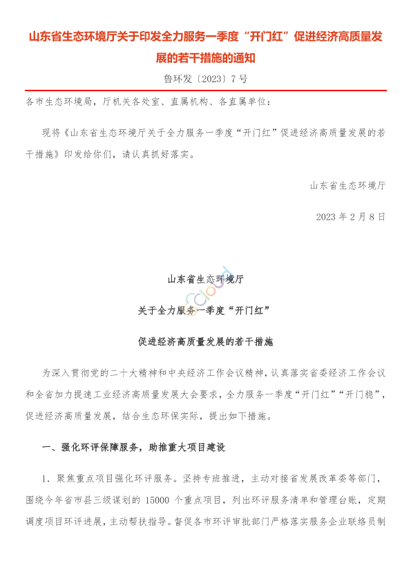 各市生态环境局,厅机关各处室、直属机构、各直属单位: 现将《山东省生态环境厅关于全力服务一季度“开门红”促进经济高质量发展的若干措施》印发给你们,请认真抓好落实。 山东省生态环境厅 2023年2月8日