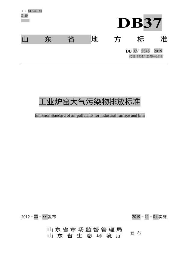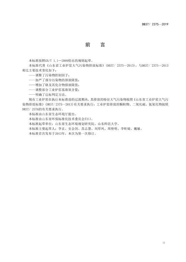 本标准按照GB/T 1.1—2009给出的规则起草。 本标准代替《山东省工业炉窑大气污染物排放标准》(DB37/ 2375—2013),与DB37/ 2375—2013 相比主要技术变化如下: ——调整了污染物控制因子; ——加严了部分污染物的排放限值; ——增加了铬及其化合物排放限值; ——调整部分工业炉窑基准氧含量; ——明确了达标判定方法。 现有工业炉窑在执行本标准前的过渡期内,其排放的特征大气污染物按照《山东省工业炉窑大气污染物排放标准》(DB37/ 2375—2013)有关要求执行;工业炉窑排放的颗粒物、二氧化硫、氮氧化物按照DB37/ 2376的有关要求执行。 本标准由山东省生态环境厅提出。 本标准由山东省环保标准化技术委员会归口。 本标准起草单位:山东省生态环境规划研究院、山东师范大学。 本标准主要起草人:李玄、史会剑、苏志慧、刘厚凤、周艳明、李昕婧、魏敏。 本标准首次发布于2013年,本次为第一次修订。