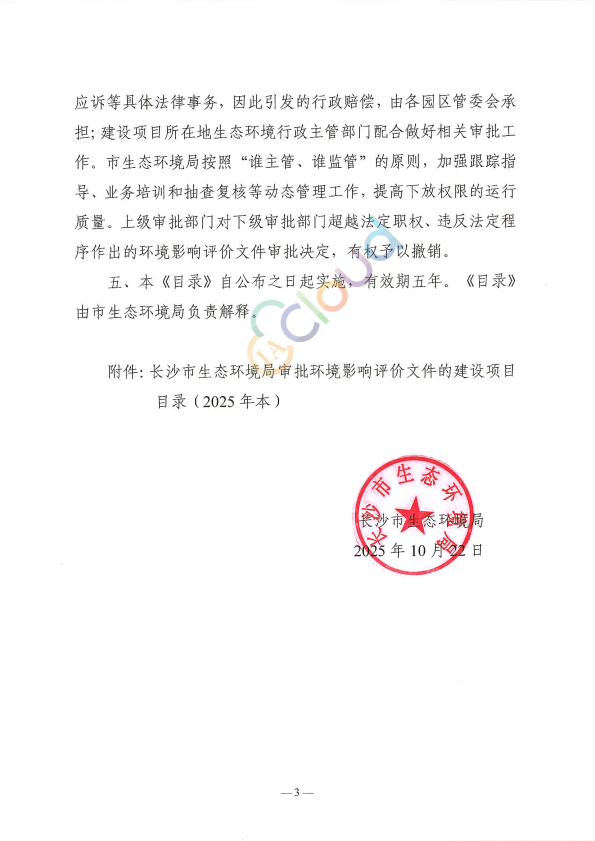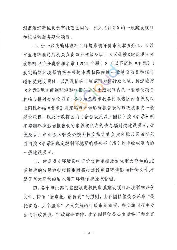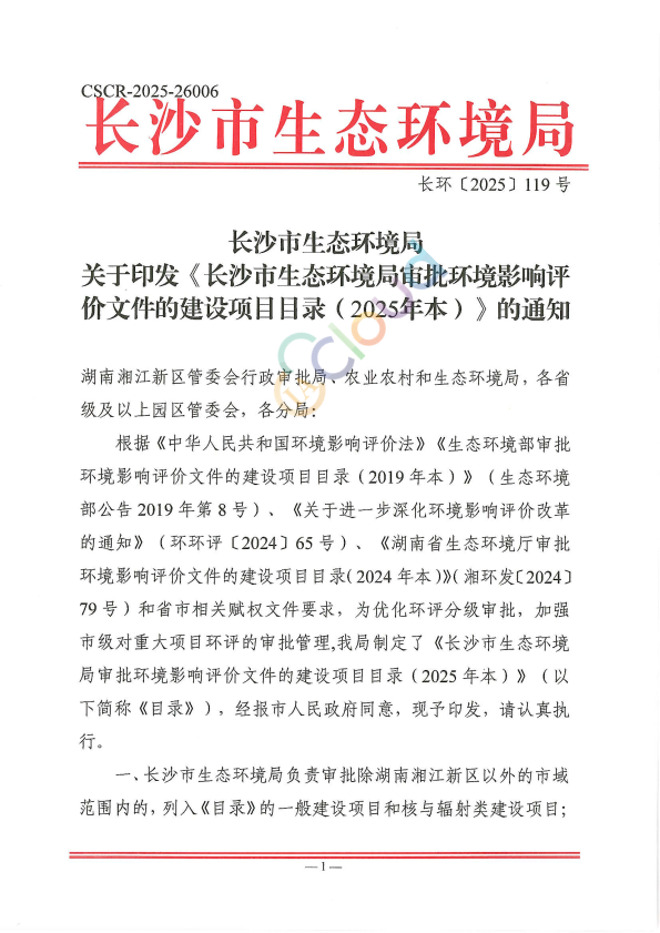 湖南湘江新区管委会行政审批局、农业农村和生态环境局,各省级及以上园区管委会,各分局: 根据《中华人民共和国环境影响评价法》《生态环境部审批环境影响评价文件的建设项目目录(2019年本)》(生态环境部公告2019年第8号)、《关于进一步深化环境影响评价改革的通知》(环环评〔2024〕65号)、《湖南省生态环境厅审批环境影响评价文件的建设项目目录(2024年本)》(湘环发〔2024〕79号)和省市相关赋权文件要求,为优化环评分级审批,加强市级对重大项目环评的审批管理,我局制定了《长沙市生态环境局审批环境影响评价文件的建设项目目录(2025年本)》(以下简称《目录》),经报市人民政府同意,现予印发,请认真执行。