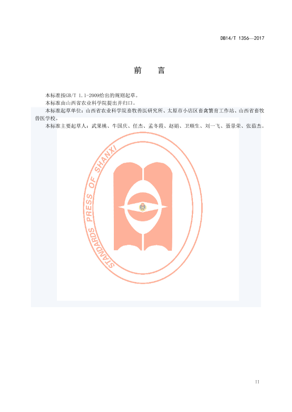 本标准按GB/T1.1-2009给出的规则起草。 本标准由山西省农业科学院提出并归口。 本标准起草单位:山西省农业科学院畜牧兽医研究所、太原市小店区畜禽繁育工作站、山西省畜牧兽医学校。 本标准主要起草人:武果桃、牛国庆、任杰、孟冬霞、赵娟、卫顺生、刘一飞、聂景荣、张茹杰。