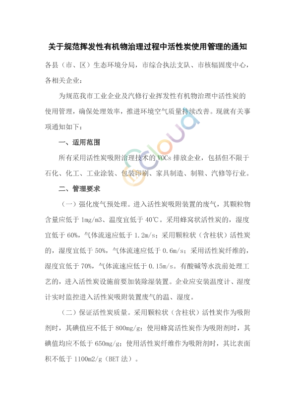 《关于规范挥发性有机物治理过程中活性炭使用管理的通知》是荆门市生态环境局发布的文件,旨在规范工业企业及汽修行业挥发性有机物(VOCs)治理中活性炭的使用管理,确保处理效率,推进环境空气质量持续改善。以下是对通知内容的分析: