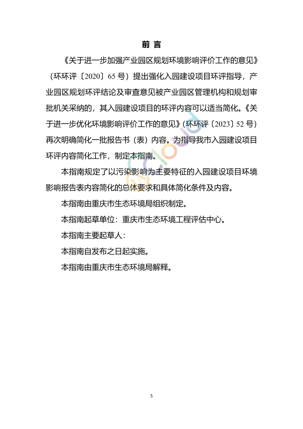 《关于进一步加强产业园区规划环境影响评价工作的意见》(环环评〔2020〕65 号)提出强化入园建设项目环评指导,产业园区规划环评结论及审查意见被产业园区管理机构和规划审批机关采纳的,其入园建设项目的环评内容可以适当简化。《关于进一步优化环境影响评价工作的意见》(环环评〔2023〕52 号)再次明确简化一批报告书(表)内容。为指导我市入园建设项目环评内容简化工作,制定本指南。 本指南规定了以污染影响为主要特征的入园建设项目环境影响报告表内容简化的总体要求和具体简化条件及内容。 本指南由重庆市生态环境局组织制定。 本指南起草单位:重庆市生态环境工程评估中心。 本指南主要起草人: 本指南自发布之日起实施。 本指南由重庆市生态环境局解释。