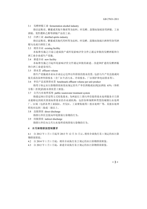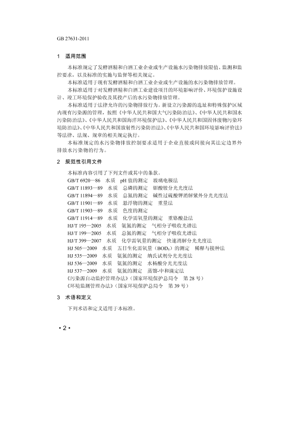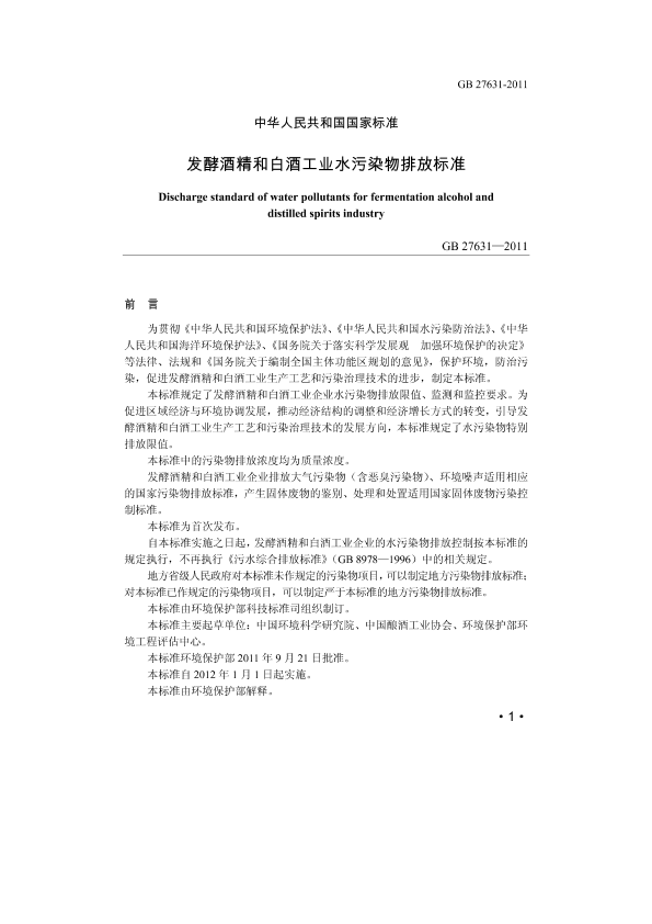 为贯彻《中华人民共和国环境保护法》、《中华人民共和国水污染防治法》、《中华人民共和国海洋环境保护法》、《国务院关于落实科学发展观 加强环境保护的决定》等法律、法规和《国务院关于编制全国主体功能区规划的意见》,保护环境,防治污染,促进发酵酒精和白酒工业生产工艺和污染治理技术的进步,制定本标准。 本标准规定了发酵酒精和白酒工业企业水污染物排放限值、监测和监控要求。为促进区域经济与环境协调发展,推动经济结构的调整和经济增长方式的转变,引导发酵酒精和白酒工业生产工艺和污染治理技术的发展方向,本标准规定了水污染物特别排放限值。 本标准中的污染物排放浓度均为质量浓度。 发酵酒精和白酒工业企业排放大气污染物(含恶臭污染物)、环境噪声适用相应的国家污染物排放标准,产生固体废物的鉴别、处理和处置适用国家固体废物污染控制标准。 本标准为首次发布。 自本标准实施之日起,发酵酒精和白酒工业企业的水污染物排放控制按本标准的规定执行,不再执行《污水综合排放标准》(GB8978-1996)中的相关规定。 地方省级人民政府对本标准未作规定的污染物项目,可以制定地方污染物排放标准;对本标准已作规定的污染物项目,可以制定严于本标准的地方污染物排放标准。 本标准由环境保护部科技标准司组织制订。 本标准主要起草单位:中国环境科学研究院、中国酿酒工业协会、环境保护部环境工程评估中心。 本标准环境保护部2011年9月21日批准。 本标准自2012年1月1日起实施。 本标准由环境保护部解释。
