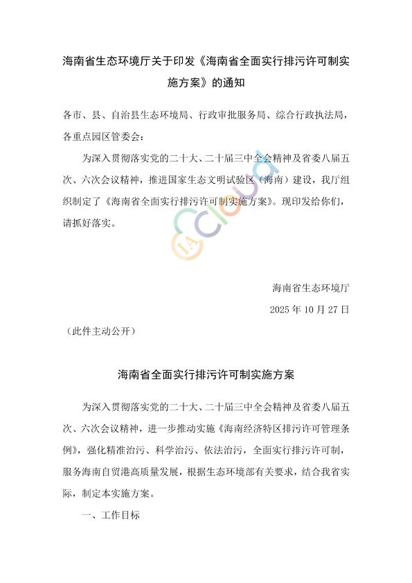 各市、县、自治县生态环境局、行政审批服务局、综合行政执法局,各重点园区管委会: 为深入贯彻落实党的二十大、二十届三中全会精神及省委八届五次、六次会议精神,推进国家生态文明试验区(海南)建设,我厅组织制定了《海南省全面实行排污许可制实施方案》。现印发给你们,请抓好落实。 海南省生态环境厅 2025年10月27日
