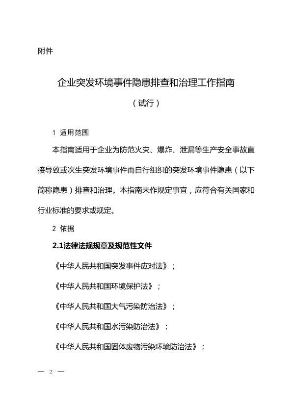 为贯彻《突发环境事件应急管理办法》,落实企业环境安全主体责任,指导企业开展突发环境事件隐患排查与治理工作,我部制订了《企业突发环境事件隐患排查与治理工作指南(试行)》,现予以发布。 特此公告。 附件:企业突发环境事件隐患排查和治理工作指南(试行) 环境保护部 2016年12月6日 抄送:各省、自治区、直辖市环境保护厅(局),各派出机构,新疆生产建设兵团环境保护局。 环境保护部办公厅2016年12月12日印发