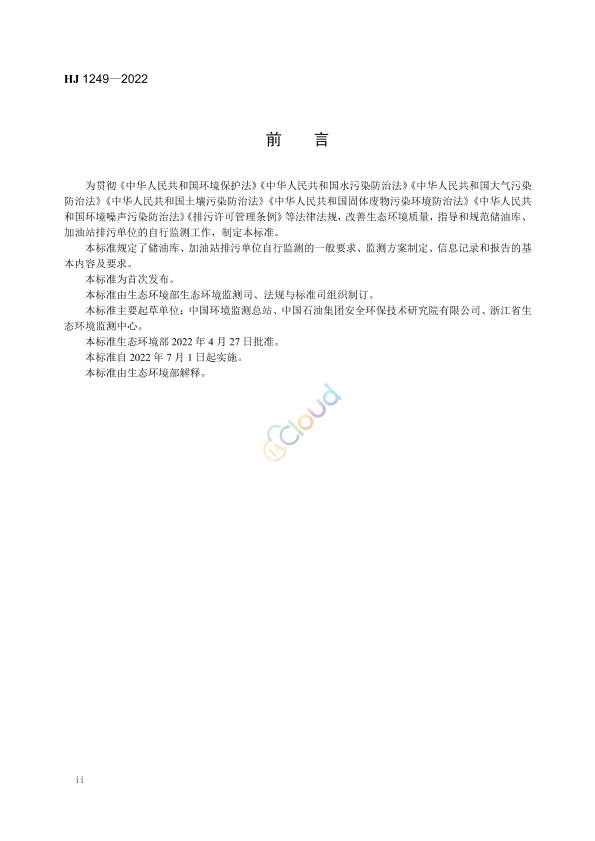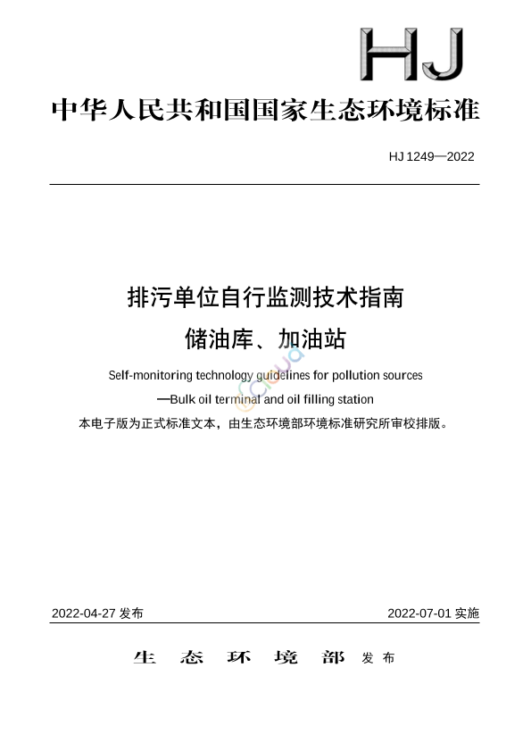 为贯彻《中华人民共和国环境保护法》《中华人民共和国水污染防治法》《中华人民共和国大气污染防治法》《中华人民共和国土壤污染防治法》《中华人民共和国固体废物污染环境防治法》《中华人民共和国环境噪声污染防治法》《排污许可管理条例》等法律法规,改善生态环境质量,指导和规范储油库、加油站排污单位的自行监测工作,制定本标准。 本标准规定了储油库、加油站排污单位自行监测的一般要求、监测方案制定、信息记录和报告的基本内容及要求。 本标准为首次发布。 本标准由生态环境部生态环境监测司、法规与标准司组织制订。 本标准主要起草单位:中国环境监测总站、中国石油集团安全环保技术研究院有限公司、浙江省生态环境监测中心。 本标准生态环境部2022年4月27日批准。 本标准自2022年7月1日起实施。 本标准由生态环境部解释。