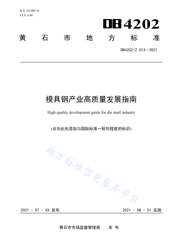 本文件提供了模具钢产业高质量发展基础要求、发展原则与目标、发展路径以及发展保障等方面的指导。 本文件适用于指导独立模具钢生产企业以及模具钢产业转型升级高质量发展工作。