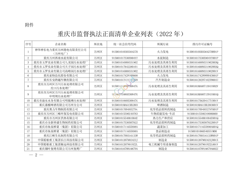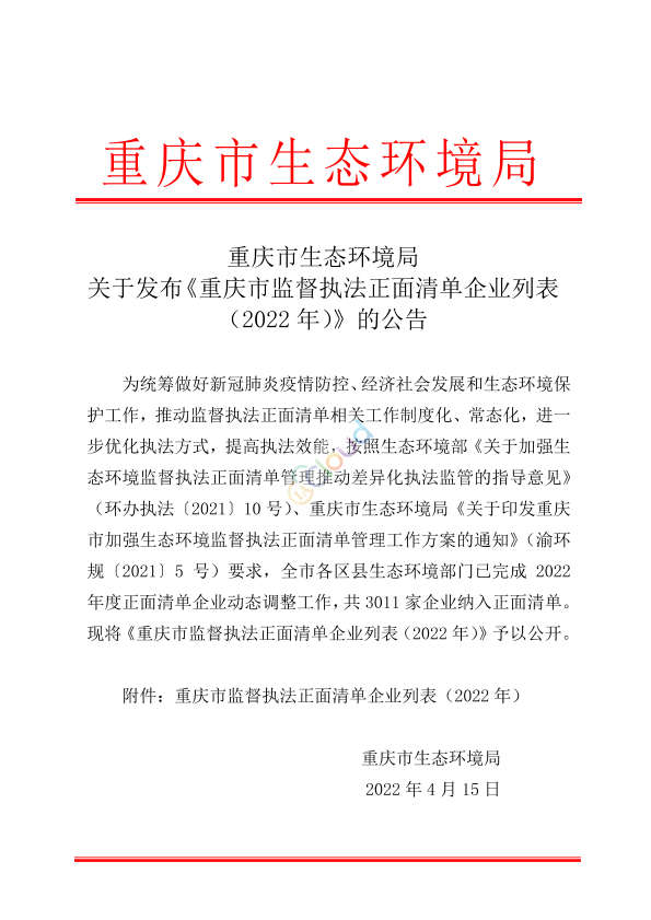 为统筹做好新冠肺炎疫情防控、经济社会发展和生态环境保护工作,推动监督执法正面清单相关工作制度化、常态化,进一步优化执法方式,提高执法效能,按照生态环境部《关于加强生态环境监督执法正面清单管理推动差异化执法监管的指导意见》(环办执法〔2021〕10 号)、重庆市生态环境局《关于印发重庆市加强生态环境监督执法正面清单管理工作方案的通知》(渝环规〔2021〕5 号)要求,全市各区县生态环境部门已完成 2022年度正面清单企业动态调整工作,共 3011 家企业纳入正面清单。 现将《重庆市监督执法正面清单企业列表(2022 年)》予以公开。 附件:重庆市监督执法正面清单企业列表(2022 年) 重庆市生态环境局 2022年4月15日