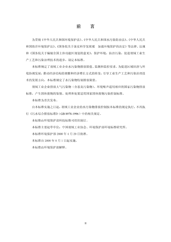 为贯彻《中华人民共和国环境保护法》、《中华人民共和国水污染防治法》、《中华人民共和国海洋环境保护法》、《国务院关于落实科学发展观 加强环境保护的决定》等法律、法规和《国务院关于编制全国主体功能区规划的意见》,保护环境,防治污染,促进羽绒工业生产工艺和污染治理技术的进步,制定本标准。 本标准规定了羽绒工业企业水污染物排放限值、监测和监控要求。为促进区域经济与环境协调发展,推动经济结构的调整和经济增长方式的转变,引导工业生产工艺和污染治理技术的发展方向,本标准规定了水污染物特别排放限值。 羽绒工业企业排放大气污染物(含恶臭污染物)、环境噪声适用相应的国家污染物排放标准,产生固体废物的鉴别、处理和处置适用国家固体废物污染控制标准。 本标准为首次发布。 自本标准实施之日起,羽绒工业企业的水污染物排放控制按本标准的规定执行,不再执行《污水综合排放标准》(GB 8978-1996)中的相关规定。 本标准由环境保护部科技标准司组织制定。 本标准起草单位:中国羽绒工业协会、环境保护部环境标准研究所。 本标准环境保护部2008年4月29日批准。 本标准自2008年8月1日起实施。 本标准由环境保护部解释。