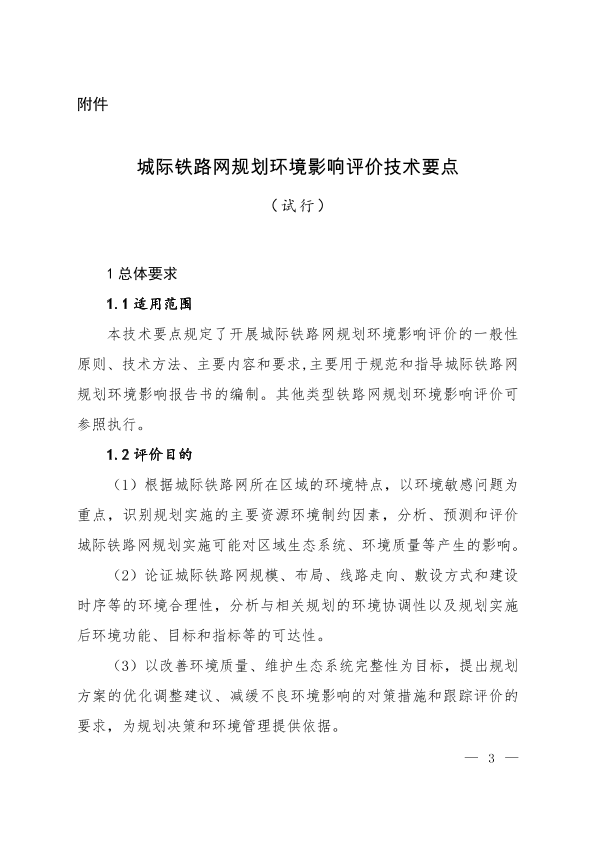 关于印发《城际铁路网规划环境影响评价技术要点(试行)》的通知 各省、自治区、直辖市环境保护厅(局),新疆生产建设兵团环境保护局,各有关单位: 为贯彻落实《规划环境影响评价条例》,规范和指导城际铁路网规划环境影响评价工作,提高城际铁路网规划环境影响报告书质量,促进城际铁路与生态环境保护协调可持续发展,我部组织制定了《城际铁路网规划环境影响评价技术要点(试行)》(见附件)。现印发给你们,请参考执行。 附件:城际铁路网规划环境影响评价技术要点(试行) 环境保护部办公厅 2017年5月22日 抄送:发展改革委、住房城乡建设部、交通运输部、国家铁路局、铁路总公司办公厅(综合司)。 环境保护部办公厅2017年5月23日印发