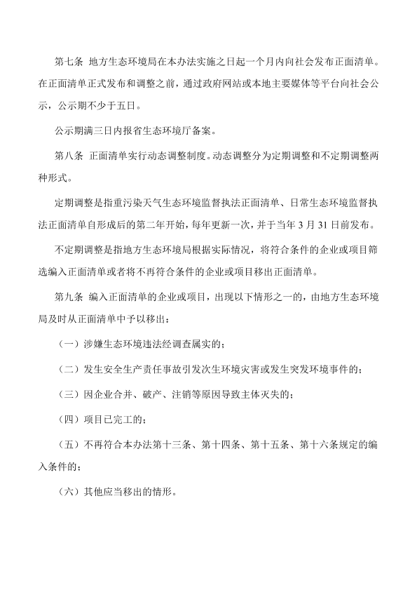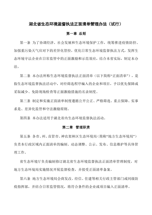 各市、州、直管市、神农架林区生态环境局: 为贯彻落实生态环境部《关于统筹做好疫情防控和经济社会发展和生态环保工作的指导意见》(环综合〔2020〕13号),省生态环境厅研究制定了《湖北省生态环境监督执法正面清单管理办法(试行)》。经2020年第4次厅长办公会审议通过,现印发给你们,请遵照执行。 附件:湖北省生态环境监督执法正面清单管理办法(试行) 湖北省生态环境厅 2020年3月25日