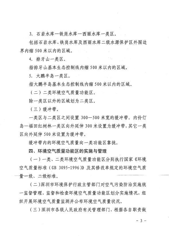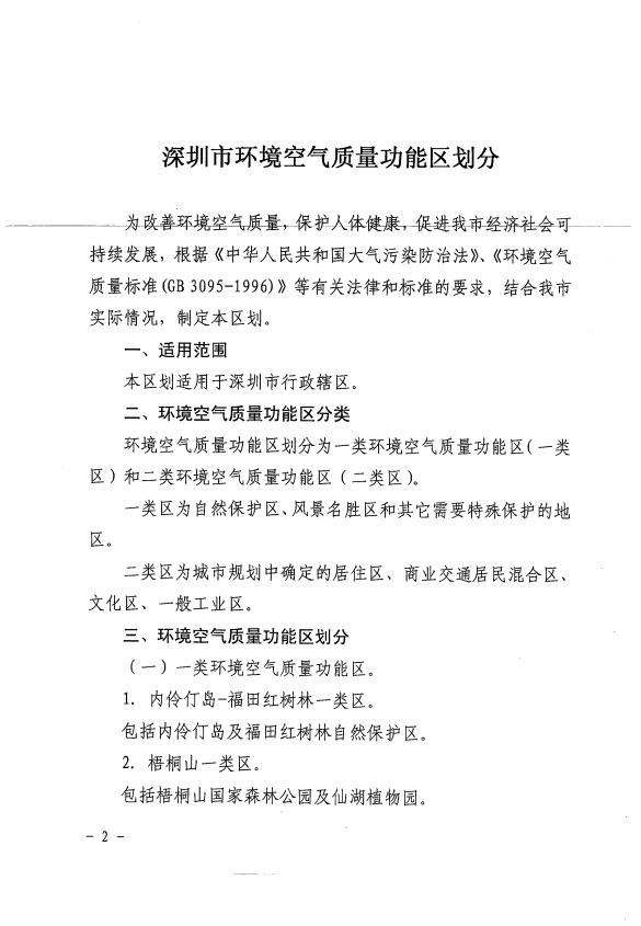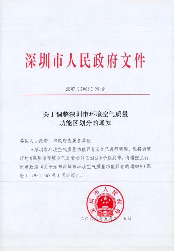 各区人民政府,市政府直属各单位: 《深圳市环境空气质量功能区划分》已进行调整,现将调整后的《深圳市环境空气质量功能区划分》予以发布,请遵照执行。原市政府《关于颁布深圳市环境空气质量功能区划的通知》(深府[1996]362号)同时废止。 深圳市人民政府 2008年5月25日