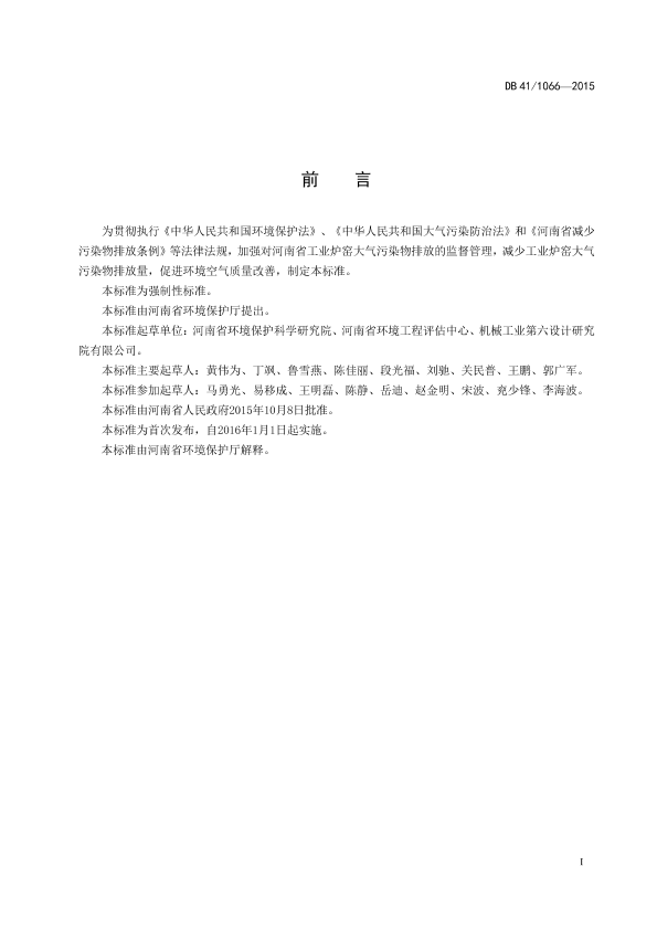 为贯彻执行《中华人民共和国环境保护法》、《中华人民共和国大气污染防治法》和《河南省减少污染物排放条例》等法律法规,加强对河南省工业炉窑大气污染物排放的监督管理,减少工业炉窑大气污染物排放量,促进环境空气质量改善,制定本标准。 本标准为强制性标准。 本标准由河南省环境保护厅提出。 本标准起草单位:河南省环境保护科学研究院、河南省环境工程评估中心、机械工业第六设计研究院有限公司。 本标准主要起草人:黄伟为、丁飒、鲁雪燕、陈佳丽、段光福、刘驰、关民普、王鹏、郭广军。 本标准参加起草人:马勇光、易移成、王明磊、陈静、岳迪、赵金明、宋波、兖少锋、李海波。 本标准由河南省人民政府2015年10月8日批准。 本标准为首次发布,自2016年1月1日起实施。 本标准由河南省环境保护厅解释。
