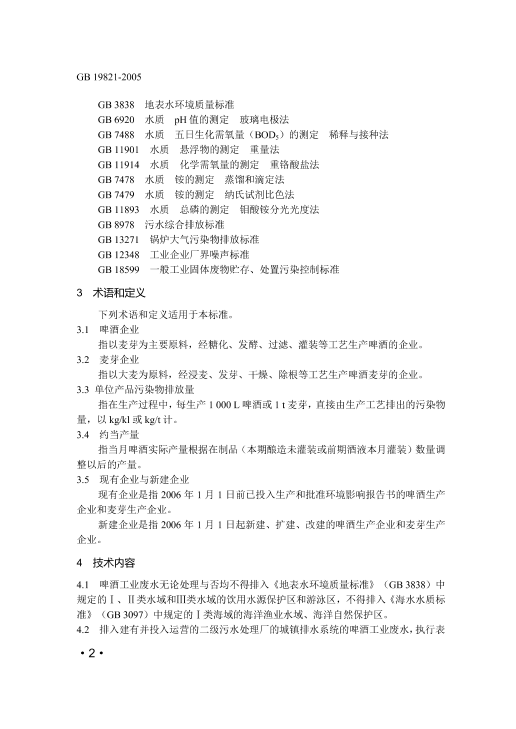 为贯彻《中华人民共和国环境保护法》、《中华人民共和国水污染防治法》和《中华人民共和国海洋环境保护法》,促进啤酒工业生产工艺和污染治理技术进步,加强啤酒企业污染物的排放控制,防治污染,保障人体健康,维护良好的生态环境,结合我国啤酒行业的相关政策,制定本标准。 本标准规定了啤酒工业污染物排放浓度限值和单位产品污染物排放量。 本标准自实施之日起,替代GB 8978-1996中相关规定。 本标准为首次发布。 本标准由国家环境保护总局科技标准司提出。 本标准由中国环境科学研究院和中国酿酒工业协会共同起草。 本标准由国家环境保护总局于2005年7月18日批准。 本标准自2006年1月1日起实施。 本标准由国家环境保护总局负责解释。