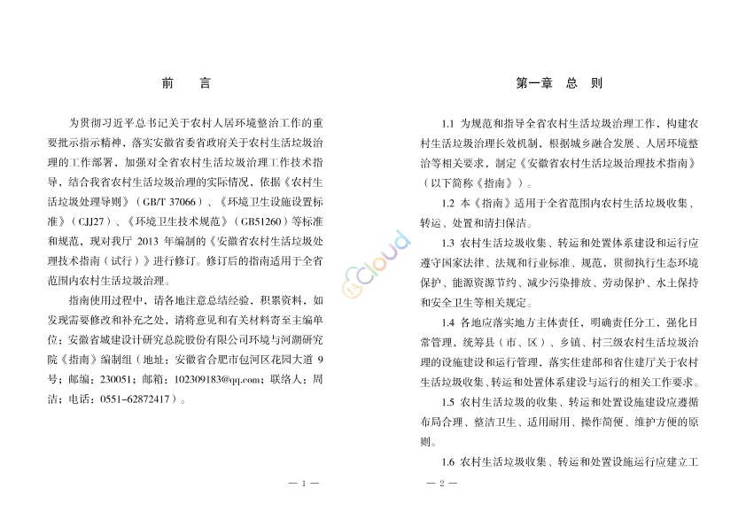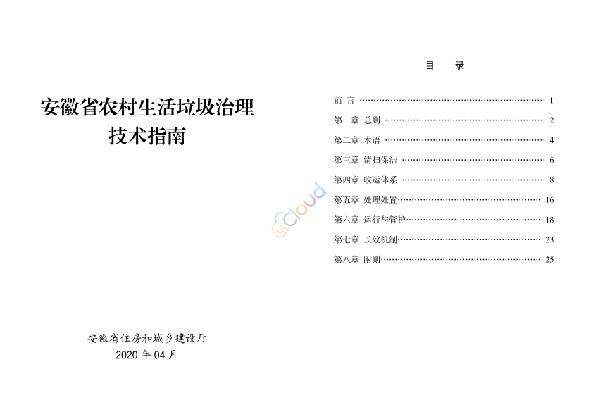 为贯彻习近平总书记关于农村人居环境整治工作的重要批示指示精神,落实安徽省委省政府关于农村生活垃圾治理的工作部署,加强对全省农村生活垃圾治理工作技术指导,结合我省农村生活垃圾治理的实际情,依据《农村生活垃圾处理导则》(GB/T 37066)、《环境卫生设施设置标准》(CJJ27)、《环境卫生技术规范》(GB51260)等标准和规范,现对我厅2013 年编制的《安徽省农村生活垃圾处理技术指南(试行)》进行修订。修订后的指南适用于全省范围内农村生活垃圾治理。指南使用过程中,请各地注意总结经验,积累资料,如发现需要修改和补充之处,请将意见和有关材料寄至主编单位:安徽省城建设计研究总院股份有限公司环境与河湖研究院《指南》编制组(地址:安徽省合肥市包河区花园大道9号;邮编:230051;邮箱:102309183@qq.com;联络人:周洁;电话:0551-62872417)。