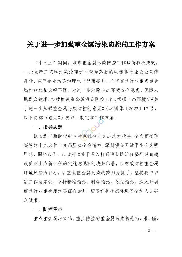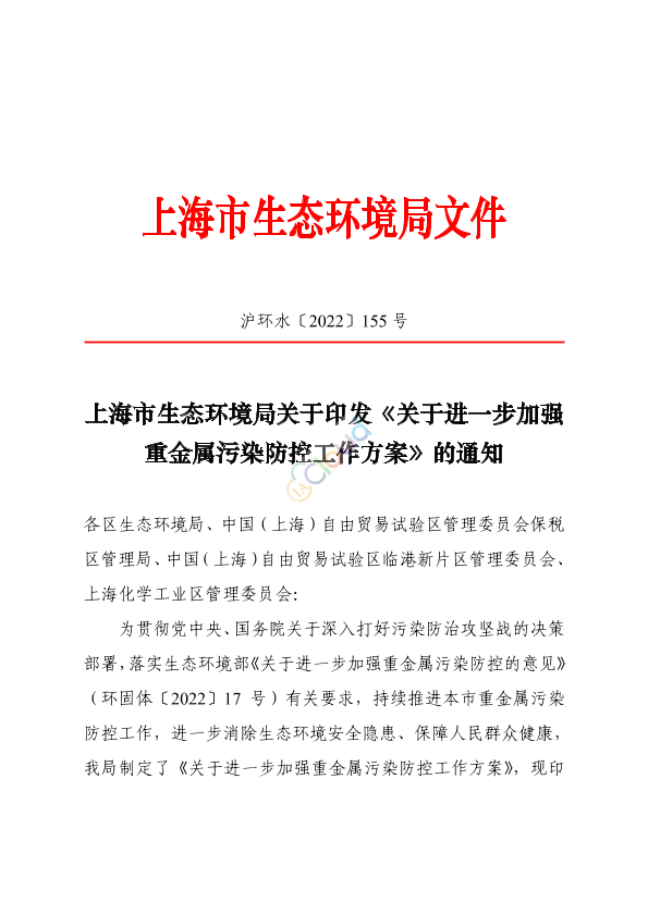 各区生态环境局、中国(上海)自由贸易试验区管理委员会保税区管理局、中国(上海)自由贸易试验区临港新片区管理委员会、上海化学工业区管理委员会: 为贯彻党中央、国务院关于深入打好污染防治攻坚战的决策部署,落实生态环境部《关于进一步加强重金属污染防控的意见》(环固体〔2022〕17号)有关要求,持续推进本市重金属污染防控工作,进一步消除生态环境安全隐患、保障人民群众健康,我局制定了《关于进一步加强重金属污染防控工作方案》,现印发给你们,请结合实际组织落实。 上海市生态环境局 2022年9月5日