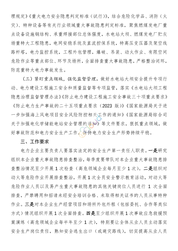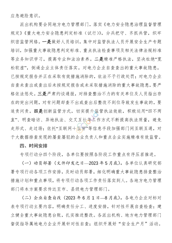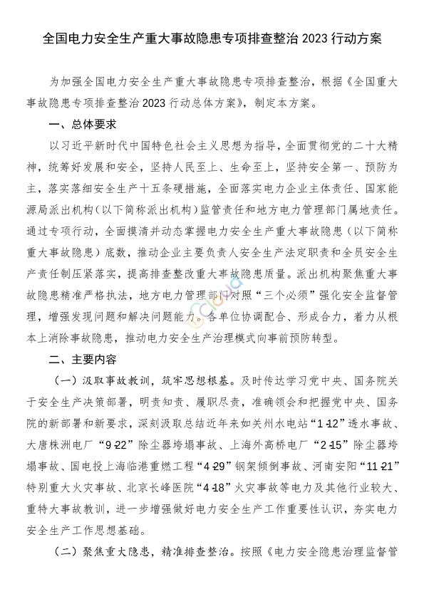各省(自治区、直辖市)能源局,有关省(自治区、直辖市)及新疆生产建设兵团发展改革委、工业和信息化主管部门,北京市城市管理委,各派出机构、大坝中心,全国电力安委会各企业成员单位,有关单位: 为认真贯彻落实党的二十大精神和习近平总书记关于安全生产重要论述,按照党中央、国务院决策部署,进一步落实国务院安全生产委员会全体会议有关部署,按照国务院安委会《全国重大事故隐患专项排查整治2023行动总体方案》各项工作要求,从即日起开展全国电力安全生产重大事故隐患专项排查整治2023行动。现将方案印发给你们,请结合实际认真抓好落实。 联系人及电话:康 伟 010-81929632 国家能源局 2023年5月8日 附件:全国电力安全生产重大事故隐患专项排查整治2023行动方案