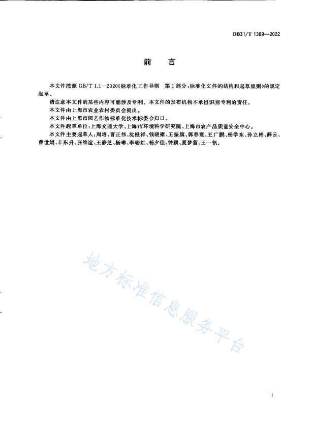 本文件按照GB/T 1.1 -2020《标准化工作导则第1部分:标准化文件的结构和起草规则》的规定起草。 请注意本文件的某些内容可能涉及专利。本文件的发布机构不承担识别专利的责任。 本文件由上海市农业农村委员会提出。 本文件由上海市园艺作物标准化技术标委会归口。 本文件起草单位:上海交通大学、上海市环境科学研究院、上海市农产品质量安全中心。 本文件主要起草人:周培、曹正伟、沈根祥、钱晓雍、王振旗、郭春霞.王广鹏、杨学东.孙立彬、薛云、曹世娟、丰东升、张维谊、王静芝、杨琳、李瑞红、杨夕佳、钟颖、夏梦蕾、王一钒。
