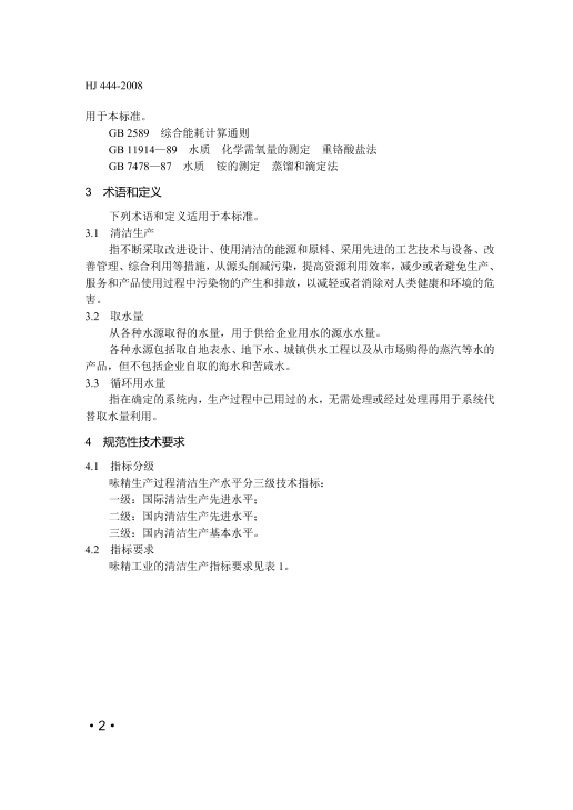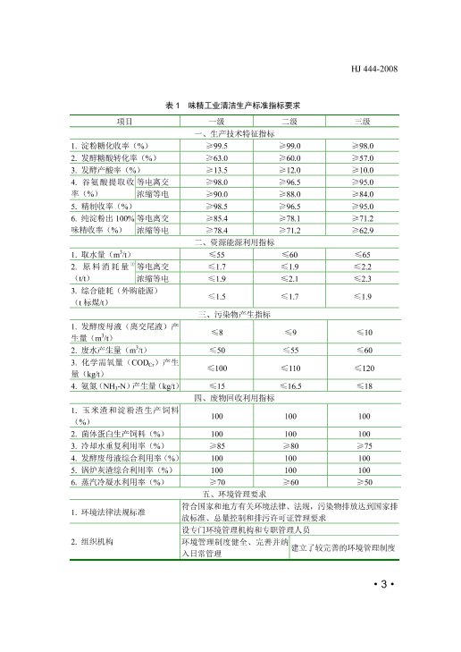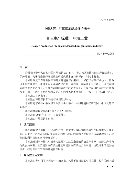 为贯彻《中华人民共和国环境保护法》和《中华人民共和国清洁生产促进法》,保护环境,为味精企业开展清洁生产提供技术支持和导向,制定本标准。 本标准规定了在达到国家和地方环境标准的基础上,根据当前的行业技术、装备水平和管理水平,味精工业企业清洁生产的一般要求。本标准分为三级,一级代表国际清洁生产先进水平,二级代表国内清洁生产先进水平,三级代表国内清洁生产基本水平。由于技术在不断进步和发展,本标准也将不断修订,一般3~5年修订一次。 本标准为首次发布。 本标准由环境保护部科技标准司组织制定。 本标准起草单位:中国轻工业清洁生产中心、中国环境科学研究院、中国发酵工业协会。 本标准环境保护部2008年9月27日批准。 本标准自2008年11月1日起实施。 本标准由环境保护部解释。