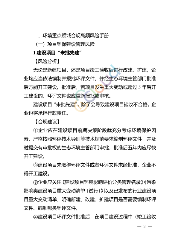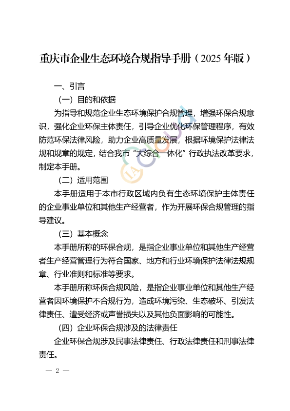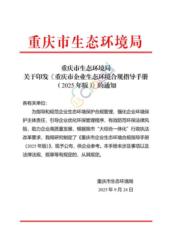 各有关单位: 为指导和规范企业生态环境保护合规管理,强化企业环境保护主体责任,引导企业优化环保管理程序,有效防范环保法律风险,助力企业高质量发展,根据我市“大综合一体化”行政执法改革要求,我局研究制定了《重庆市企业生态环境合规指导手册(2025年版)》,现予公布,供企业参考。本手册未涉及事项以及法律法规、规章等有规定的,从其规定。 重庆市生态环境局 2025年9月24日