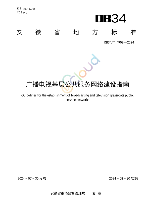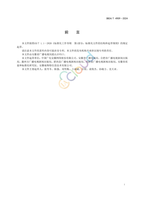 本文件按照GB/T 1.1—2020《标准化工作导则 第1部分:标准化文件的结构和起草规则》的规定起草。 请注意本文件的某些内容可能涉及专利。本文件的发布机构不承担识别专利的责任。 本文件由安徽省广播电视局提出并归口。 本文件起草单位:中国广电安徽网络股份有限公司、安徽省广播电视局、合肥市广播电视新闻出版局、滁州市广播电视新闻出版局、肥西县广播电视新闻出版局、凤阳县广播电视新闻出版局、安徽省质量和标准化研究院、安徽福斯特信息技术有限公司。 本文件主要起草人:张雪冬、陈强、刘雪梅、卜威威、汪锐、凌俊杰、孙晓方、史天亚。