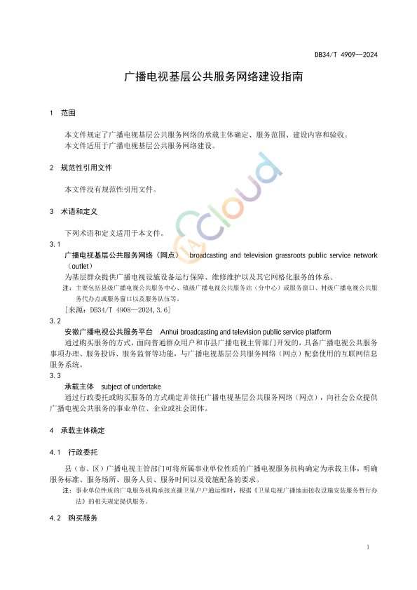 本文件规定了广播电视基层公共服务网络的承载主体确定、服务范围、建设内容和验收。 本文件适用于广播电视基层公共服务网络建设。