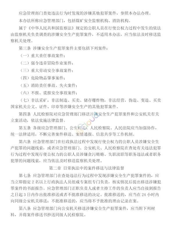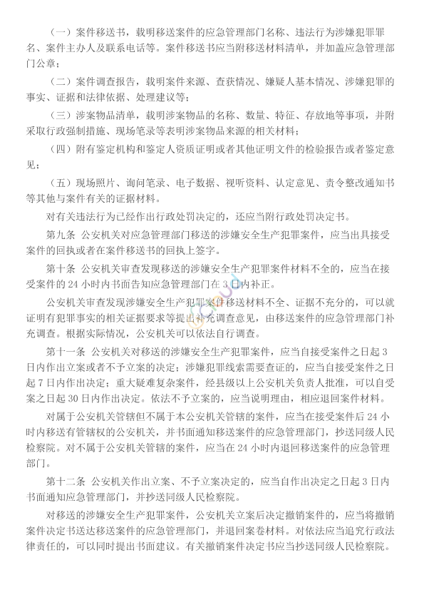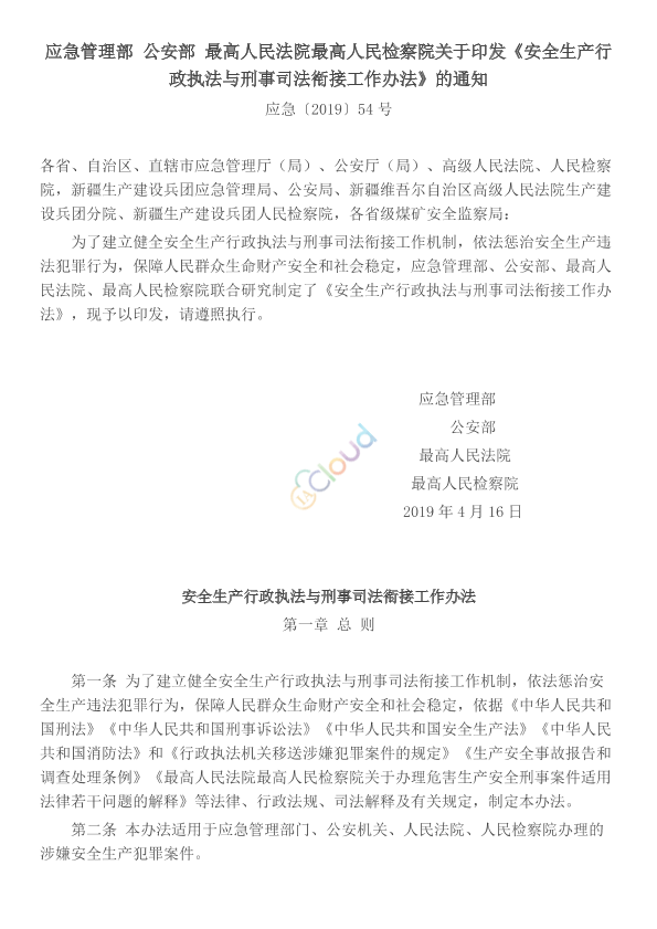 各省、自治区、直辖市应急管理厅(局)、公安厅(局)、高级人民法院、人民检察院,新疆生产建设兵团应急管理局、公安局、新疆维吾尔自治区高级人民法院生产建设兵团分院、新疆生产建设兵团人民检察院,各省级煤矿安全监察局: 为了建立健全安全生产行政执法与刑事司法衔接工作机制,依法惩治安全生产违法犯罪行为,保障人民群众生命财产安全和社会稳定,应急管理部、公安部、最高人民法院、最高人民检察院联合研究制定了《安全生产行政执法与刑事司法衔接工作办法》,现予以印发,请遵照执行。 应急管理部 公安部 最高人民法院 最高人民检察院 2019年4月16日