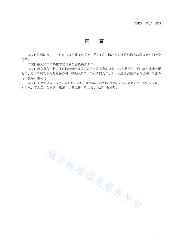 本文件按照GB/T 1.1- -2020 《标准化工作导则第1 部分:标准化文件的结构和起草规则》的规定起草。 本文件由天律市市场监督管理委员会提出并归口。 本文件起草单位:北辰区市场监督管理局、天津市乳品食品监测中心有限公司、天津海河乳业有限公司、天津伊利乳业有限责任公司、石家庄君乐宝乳业有限公司、北京三元食品股份有限公司、天津完达山乳品有限公司。 本文件主要起草人:沙杰、张传胜、李卉、刘继忠、程艳宇、徐蕊、刘猛、张进、金一尘、朱立民、宋天水、李志君、柴艳兵、张耀广、陈立俊、孙红霞、宋涛、余沛阳。