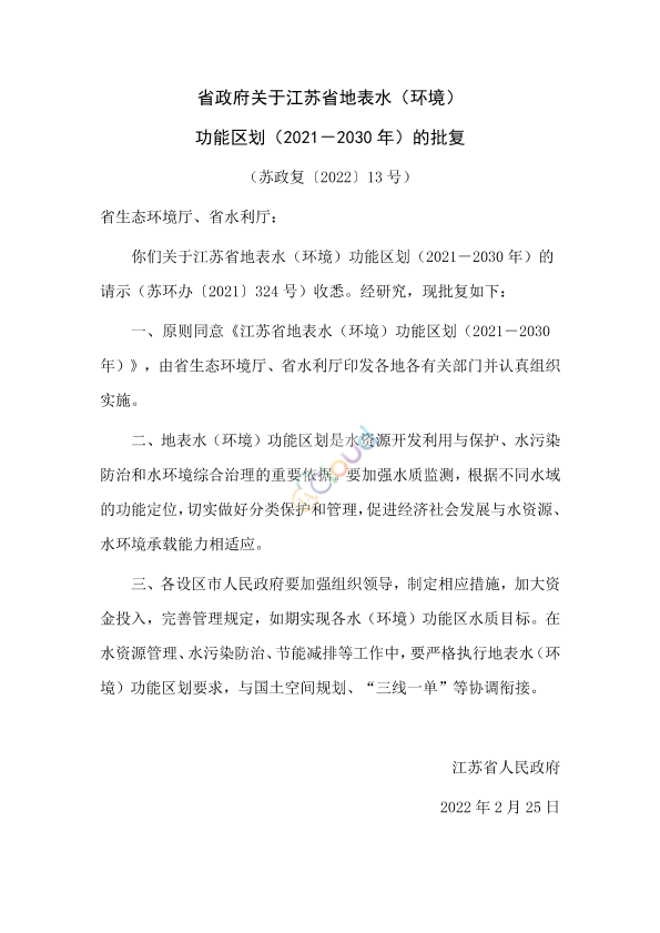 省生态环境厅、省水利厅: 你们关于江苏省地表水(环境)功能区划(2021-2030年)的请示(苏环办〔2021〕324号)收悉。经研究,现批复如下: 一、原则同意《江苏省地表水(环境)功能区划(2021-2030年)》,由省生态环境厅、省水利厅印发各地各有关部门并认真组织实施。 二、地表水(环境)功能区划是水资源开发利用与保护、水污染防治和水环境综合治理的重要依据。要加强水质监测,根据不同水域的功能定位,切实做好分类保护和管理,促进经济社会发展与水资源、水环境承载能力相适应。 三、各设区市人民政府要加强组织领导,制定相应措施,加大资金投入,完善管理规定,如期实现各水(环境)功能区水质目标。在水资源管理、水污染防治、节能减排等工作中,要严格执行地表水(环境)功能区划要求,与国土空间规划、“三线一单”等协调衔接。 江苏省人民政府 2022年2月25日