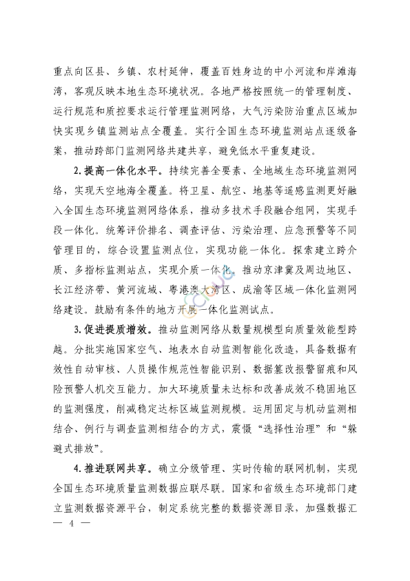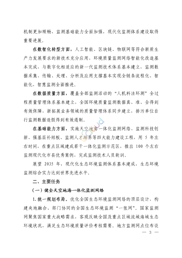 各省、自治区、直辖市生态环境厅(局),新疆生产建设兵团生态环境局: 为深入贯彻党的二十大精神和全国生态环境保护大会部署,全面推进现代化生态环境监测体系建设,全力支撑深入打好污染防治攻坚战和美丽中国建设,我部研究制定了《关于加快建立现代化生态环境监测体系的实施意见》,现印发给你们,请遵照执行。 生态环境部 2024年3月4日 (此件删减后公开) 抄送:各流域海域生态环境监督管理局,中国环境科学研究院、中国环境监测总站、中日友好环境保护中心(环境发展中心)、南京环境科学研究所、华南环境科学研究所、环境规划院、卫星环境应用中心、国家海洋环境监测中心。 生态环境部办公厅2024年3月13日印发