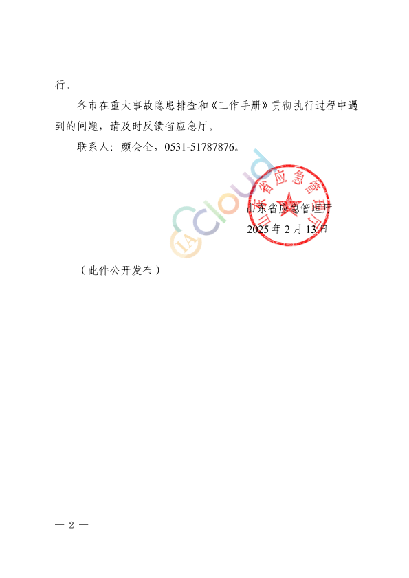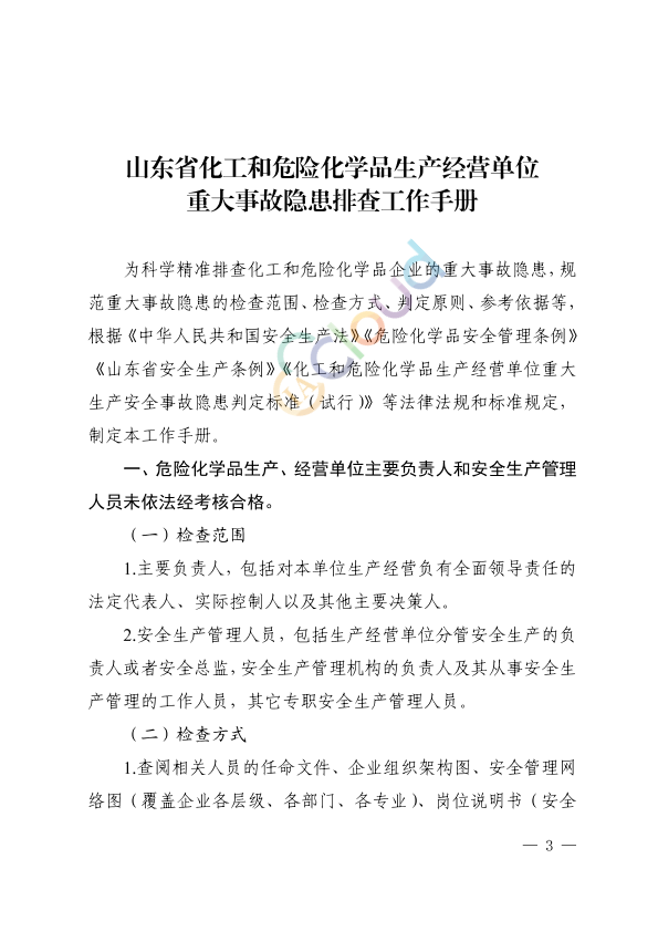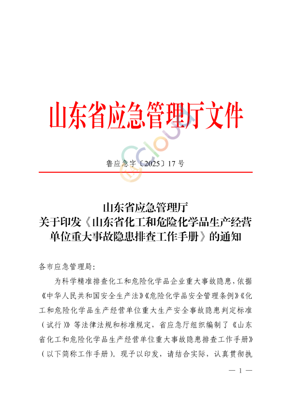 各市应急管理局: 为科学精准排查化工和危险化学品企业重大事故隐患,依据《中华人民共和国安全生产法》《危险化学品安全管理条例》《化工和危险化学品生产经营单位重大生产安全事故隐患判定标准(试行)》等法律法规和标准规定,省应急厅组织编制了《山东省化工和危险化学品生产经营单位重大事故隐患排查工作手册》(以下简称工作手册)。现予以印发,请结合实际,认真贯彻执行。 各市在重大事故隐患排查和《工作手册》贯彻执行过程中遇到的问题,请及时反馈省应急厅。 山东省应急管理厅 2025年2月13日