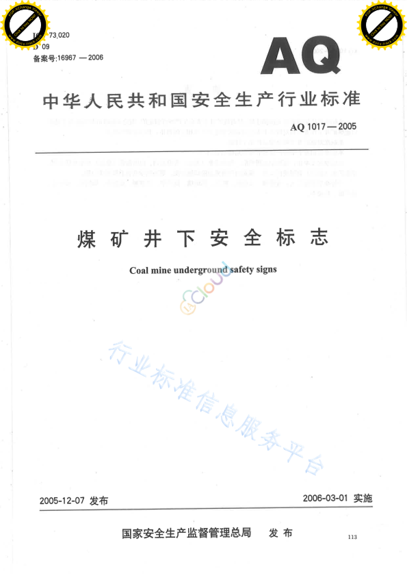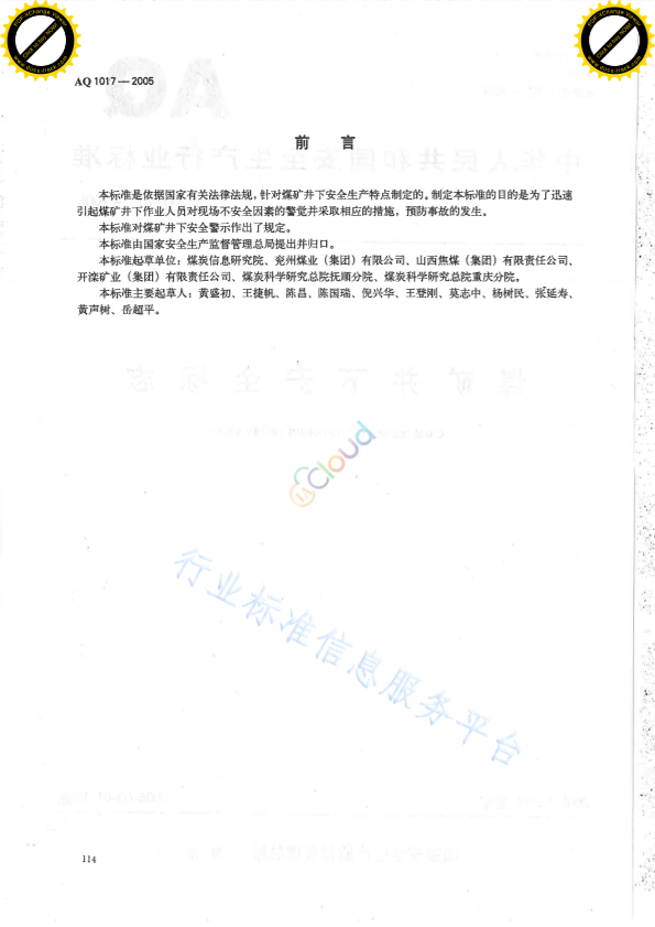 本标准是依据国家有关法律法规,针对煤矿井下安全生产特点制定的。制定本标准的目的是为了迅速引起煤矿井下作业人员对现场不安全因素的警觉并采取相应的措施,预防事故的发生。 本标准对煤矿井下安全警示作出了规定。 本标准由国家安全生产监督管理总局提出并归口。 本标准起草单位:煤炭信息研究院、兖州煤业(集团)有限公司、山西焦煤(集团)有限责任公司、 开滦矿业(集团)有限责任公司、煤炭科学研究总院抚顺分院、煤炭科学研究总院重庆分院。 本标准主要起草人:黄盛初、王捷帆、陈昌、陈国瑞、倪兴华、王登刚、莫志中、杨树民、张延寿、黄声树、岳超平。