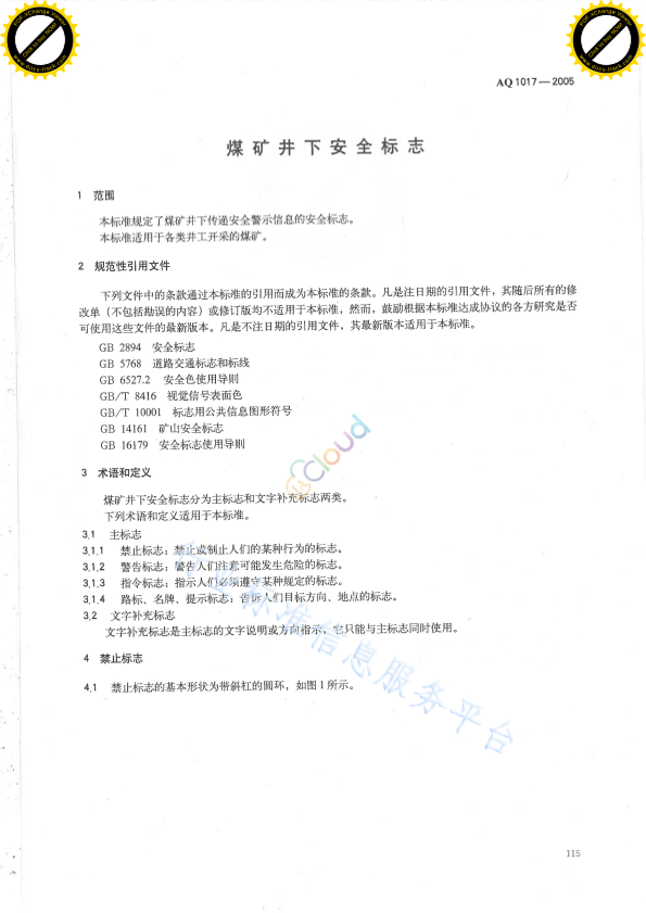 本标准规定了煤矿井下传递安全警示信息的安全标志。 本标准适用于各类井工开采的煤矿。