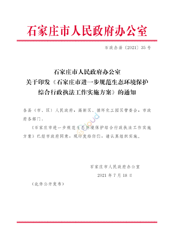 各县(市、区)人民政府,高新区、循环化工园区管委会,市政府各部门: 《石家庄市进一步规范生态环境保护综合行政执法工作实施方案》已经市政府同意,现印发给你们,请认真组织实施。 石家庄市人民政府办公室 2021年7月18日