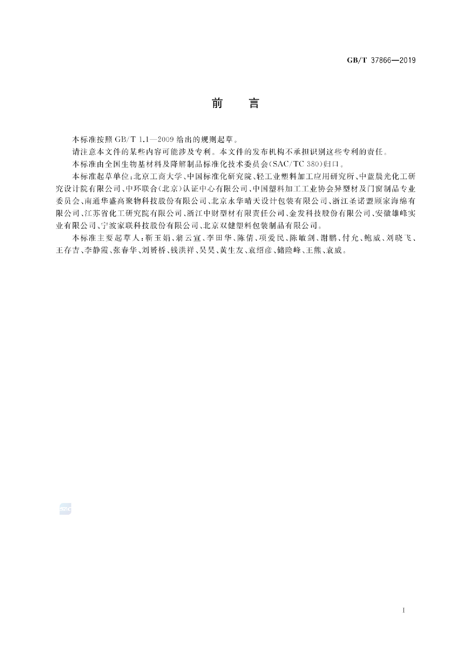 本标准按照GB/T 1.1—2009给出的规则起草。 请注意本文件的某些内容可能涉及专利。本文件的发布机构不承担识别这些专利的责任。 本标准由全国生物基材料及降解制品标准化技术委员会(SAC/TC380)归口。 本标准起草单位:北京工商大学 、中国标准化研究院 、轻工业塑料加工应用研究所 、中蓝晨光化工研究设计院有限公司 、中环联合(北京)认证中心有限公司 、中国塑料加工工业协会异型材及门窗制品专业委员会 、南通华盛高聚物科技股份有限公司 、北京永华晴天设计包装有限公司 、浙江圣诺盟顾家海绵有限公司 、江苏省化工研究院有限公司 、浙江中财型材有限责任公司 、金发科技股份有限公司 、安徽雄峰实业有限公司 、宁波家联科技股份有限公司 、北京双健塑料包装制品有限公司 。 主要起草人:靳玉娟 、翁云宣 、李田华 、陈倩 、项爱民 、陈敏剑 、谢鹏 、付允 、鲍威 、刘晓飞 、王存吉 、李静霞 、张春华 、刘赟桥 、钱洪祥 、吴昊 、黄生友 、袁绍彦 、储险峰 、王熊 、袁威 。