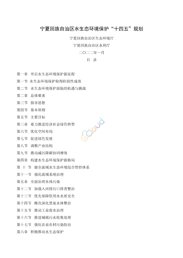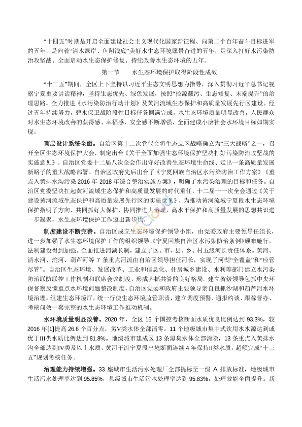 各市、县(区)人民政府,自治区发展改革委、科技厅、工业和信息化厅、财政厅、自然资源厅、住房城乡建设厅、交通运输厅、农业农村厅、卫生健康委、林草局,宁东能源化工基地管委会,农垦集团: 为贯彻落实习近平生态文明思想和习近平总书记视察宁夏重要讲话精神,积极推进环境污染防治率先区建设,深入打好碧水保卫战,持续改善全区水生态环境质量,依据《水污染防治法》《宁夏回族自治区国民经济和社会发展第十四个五年规划和2035年远景目标纲要》《宁夏回族自治区生态环境保护“十四五”规划》,自治区生态环境厅、水利厅会同有关部门组织编制了《宁夏回族自治区水生态环境保护“十四五”规划》(以下简称《规划》)。经自治区人民政府批准,现将《规划》印发给你们,请结合实际,认真组织实施。 附件:《宁夏回族自治区水生态环境保护“十四五”规划》 宁夏回族自治区生态环境厅 宁夏回族自治区水利厅 2022年1月14日