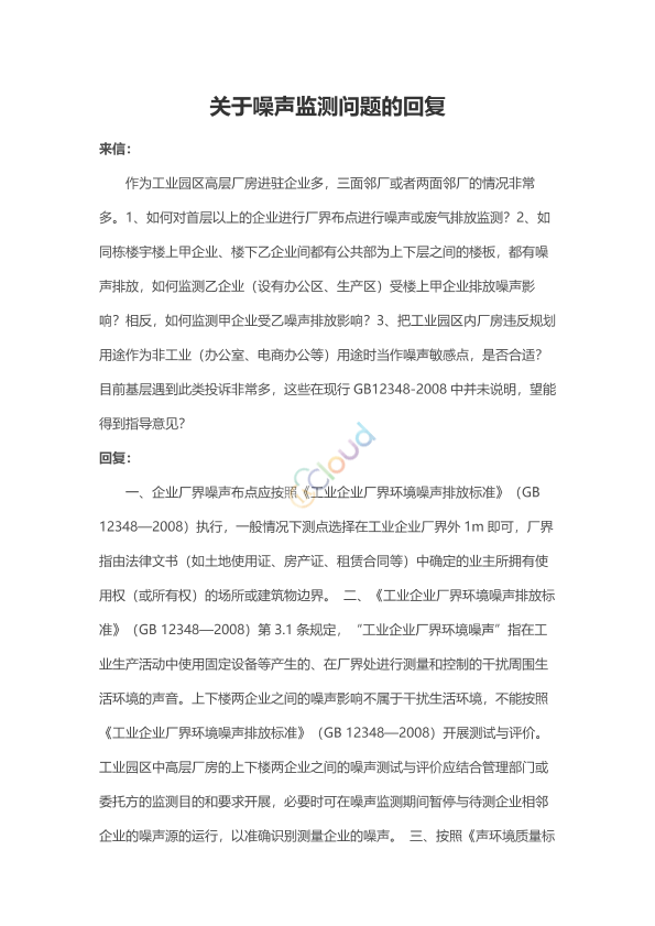 来信: 作为工业园区高层厂房进驻企业多,三面邻厂或者两面邻厂的情况非常多。1、如何对首层以上的企业进行厂界布点进行噪声或废气排放监测?2、如同栋楼宇楼上甲企业、楼下乙企业间都有公共部为上下层之间的楼板,都有噪声排放,如何监测乙企业(设有办公区、生产区)受楼上甲企业排放噪声影响?相反,如何监测甲企业受乙噪声排放影响?3、把工业园区内厂房违反规划用途作为非工业(办公室、电商办公等)用途时当作噪声敏感点,是否合适?目前基层遇到此类投诉非常多,这些在现行GB12348-2008中并未说明,望能得到指导意见?