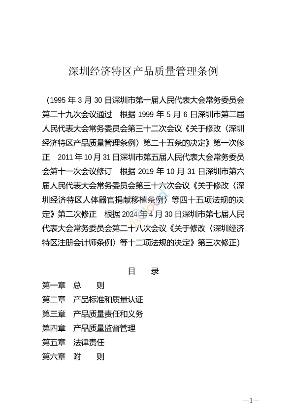 1995年3月30日深圳市第一届人民代表大会常务委员会第二十九次会议通过 根据1999年5月6日深圳市第二届人民代表大会常务委员会第三十二次会议《关于修改〈深圳经济特区产品质量管理条例〉第二十五条的决定》第一次修正 2011年10月31日深圳市第五届人民代表大会常务委员会第十一次会议修订 根据2019年10月31日深圳市第六届人民代表大会常务委员会第三十六次会议《关于修改〈深圳经济特区人体器官捐献移植条例〉等四十五项法规的决定》第二次修正 根据2024年4月30日深圳市第七届人民代表大会常务委员会第二十八次会议《关于修改〈深圳经济特区注册会计师条例〉等十二项法规的决定》第三次修正