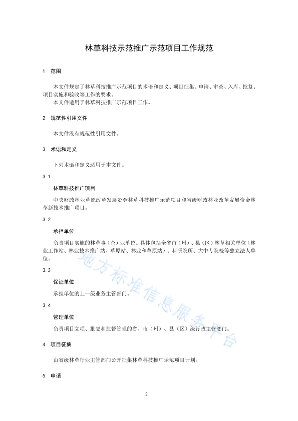 本文件规定了林草科技推广示范项目的术语和定义、项目征集、申请、审查、入库、批复、项目实施和验收等工作的要求。 本文件适用于林草科技推广示范项目工作。