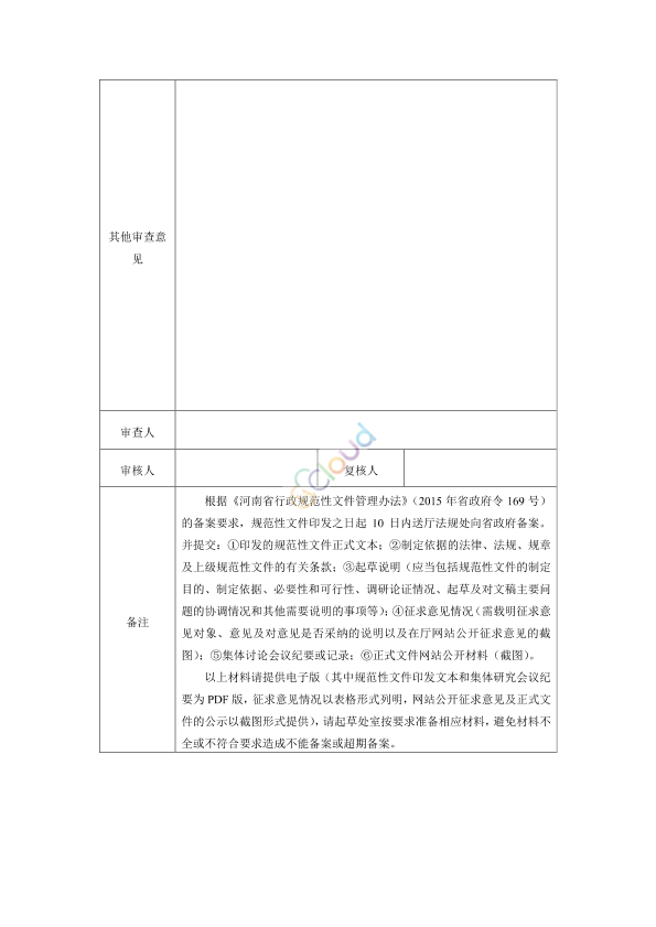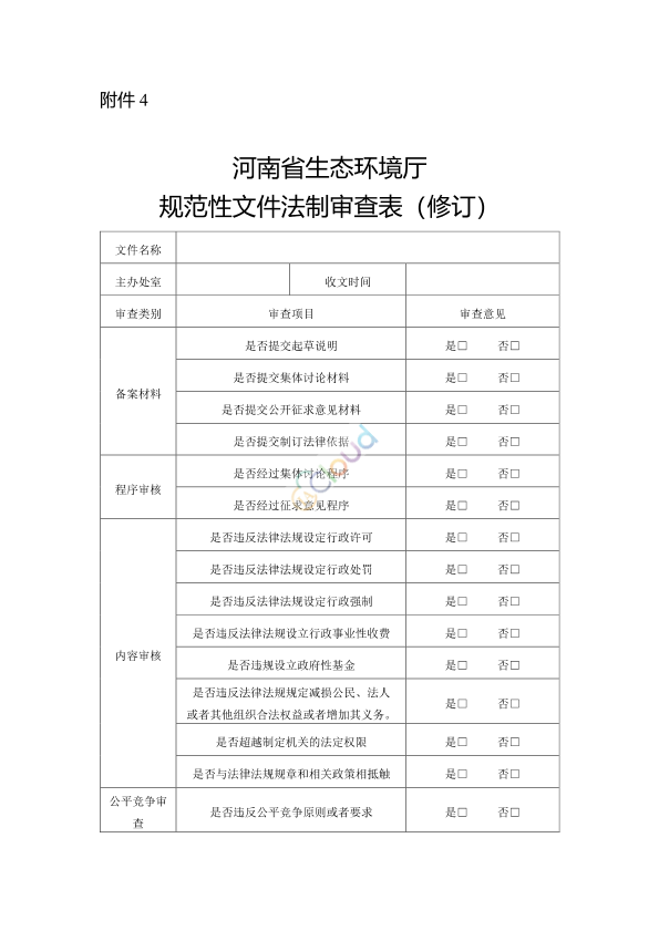 机关各处室、各区域督察办、直属各单位: 根据党中央、国务院和省委、省政府法治建设工作要求,为进一步加强规范性文件管理工作,我厅制定(修订)了《河南省生态环境厅规范性文件管理办法》《河南省生态环境厅规范性文件法制审查办法(修订)》《河南省生态环境厅规范性文件认定指导意见》《河南省生态环境厅规范性文件法制审查表(修订)》四个文件,现予印发,请遵照执行。 附件1 河南省生态环境厅规范性文件管理办法.pdf 附件2 河南省生态环境厅规范性文件法制审查办法(修订).pdf 附件3 河南省生态环境厅规范性文件认定指导意见.pdf 附件4 河南省生态环境厅规范性文件法制审查表(修订).docx 2022年8月17日 河南省生态环境厅办公室 2022年8月17日印发