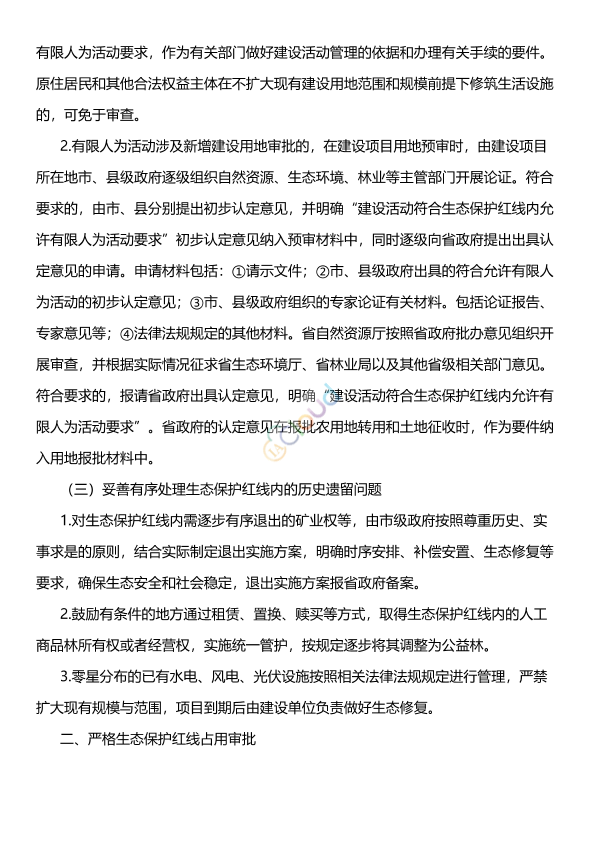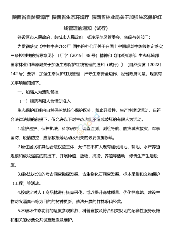 各设区市人民政府,韩城市人民政府,杨凌示范区管委会,省级有关部门: 为贯彻落实《中共中央办公厅 国务院办公厅关于在国土空间规划中统筹划定落实三条控制线的指导意见》(厅字〔2019〕48号)精神和《自然资源部 生态环境部 国家林业和草原局关于加强生态保护红线管理的通知(试行)》(自然资发〔2022〕142号)要求,加强生态保护红线管理,严守生态安全边界,经省政府同意,现就有关事项通知如下。