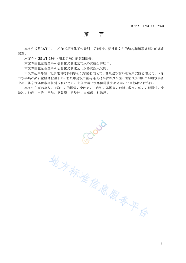 本文件按照GB/T 1.1—2020《标准化工作导则第1部分:标准化文件的结构和起草规则》的规定起草。 本文件为DB11/T 1764《用水定额》的第18部分。 本文件由北京市经济和信息化局和北京市水务局提出并归口。 本文件由北京市经济和信息化局和北京市水务局组织实施。 本文件起草单位:北京建筑材料科学研究总院有限公司、北京建筑材料检验研究院有限公司、国家节水器具产品质量监督检验中心、北京市建筑节能与建筑材料管理办公室、北京市房山区节约用水事务中心、北京金隅琉水环保科技有限公司、北京金隅北水环保科技有限公司、中国标准化研究院。 本文件主要起草人:王海生、马国儒、李俊亮、王璇熙、郑国庆、孙博、薛睿、韩力、程国伟、李铁冰、孙震、白岩、冯喆、罗乾骥、胡梦婷、田瑞霞、崔淑凤。