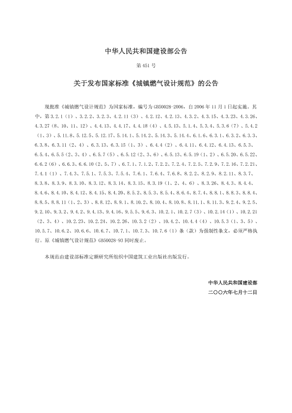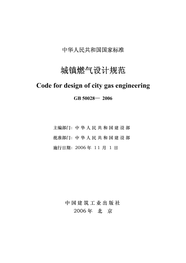 本规范是根据建设部《关于印发〈2000 至2001 年度工程建设国家标准制订、修订计划〉的通知》(建标[2001]87 号)的要求,对《城镇燃气设计规范》GB50028-93(指已经局部修订后的1998年版本)进行的全面修订。 本规范由建设部负责主编,具体由中国市政工程华北设计研究院会同城镇燃气行业生产企业、设计院和相关生产厂等有关单位共同修订。 本规范共分 10 章和7 个附录,其主要内容有:总则、术语、用气量和燃气质量、制气、净化、燃气输配系统、压缩天然气供应、液化石油气供应、液化天然气气化站和燃气的应用等。规范修订工作分为两步进行:第一步为了适应西气东输工程中城镇燃气工程的急需,对总则、用气量和燃气质量、燃气输配系统三章先行修订,已于2002 年8 月完成报批并经建设部批准颁布实施;第二步修订内容为其余七章,是这次送审的。 本规范修订的主要内容有: 1、在用气量的计算中,扩大了用气范围(有条件时,应包括采暖通风和空调、燃气汽车用气量);删除了居民生活和商业用户用气量指标;提出了采暖用气量的计算原则。 2、在燃气质量中,补充和调正了对天然气的质量要求;对采用液化石油气与空气的混合气,提出了质量安全指标;进一步提出了对燃气加臭的标准。 3、在制气和净化中,围绕人工煤气生产,主要补充了二段发生炉制气、轻油制气、天然气改制、一氧化碳变换和煤气脱水,并对主要生产场所火灾及爆炸危险分类等级等规范条文进行了修订。 4、在燃气输配系统中:提高了城镇燃气管道压力至4.0Mpa,吸收了英国气体工程学会标准IGE/TD/I 和美国联邦法规第49 号192 部分、美国联邦标准ANSIASME B31.8 等先进标准成果,对高压燃气管道敷设、管道结构设计做了规定,补充了新型管材、地上燃气管道敷设,门站、储配站设计和调压站设置形式、管道水力计算等。 5、在新增压缩天然气供应中,重点包含压缩天然气加气站、储配站、瓶组供气站及配套设施要求。 6、在液化石油气供应中,补充了液化石油和空气的混气站、气化站、瓶组气化站及瓶装供应站等有关内容。 7、在新增液化天然气气化站中,重点内含储罐与站外、建、构筑物的防火间距,站内总平面布置防火间距及配套设施等要求。 8、在燃气的应用中,补充了新型管材,燃气管道和燃气用具在地下室、半地下室和地上密封室内的敷设要求,室内燃气管道的暗设,燃气的安全监控设施及燃烧烟气的排除等。 为了便于审查,本规范在印刷上特意在新增(或修改)的条款文字下面划上实线,未划上实线的为《城镇燃气设计规范》GB50028-93(98 年版)的原有条款。考虑到章节之间的联系和相互引用及章节条号的变化,现将已经审查批准颁发实施的总则、用气量和燃气质量、燃气输配系统三章和这次送审的七章合编在一起。 对于本规范需要修改和补充之处,请将意见和有关资料寄送:天津市气象台路中国市政工程华北设计研究院城镇燃气设计规范国家标准管理组,邮政编码:300074,以便今后修订时参考。 本规范主编单位、参编单位及主要草人: 主编单位:中国市政工程华北设计研究院 参编单位:上海市煤气公司 沈阳市煤气总公司 成都市煤气总公司 北京市煤气热力工程设计院 苏州城建环保学院 主要草人:金石坚 陈贤仁 冯长海 戚大明高 勇 梁安馨 王昌遒 沈仲棠 严铭卿宁怀芳 粟锦康 龙惠琼 刘振华 李天凡李振玖 陈文桂 赵圭复 朱芝芳 苗树园