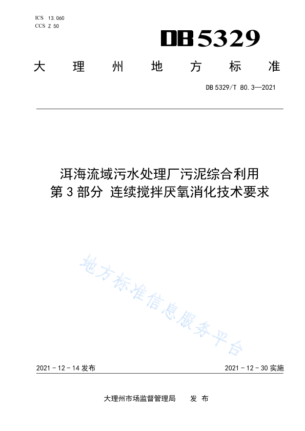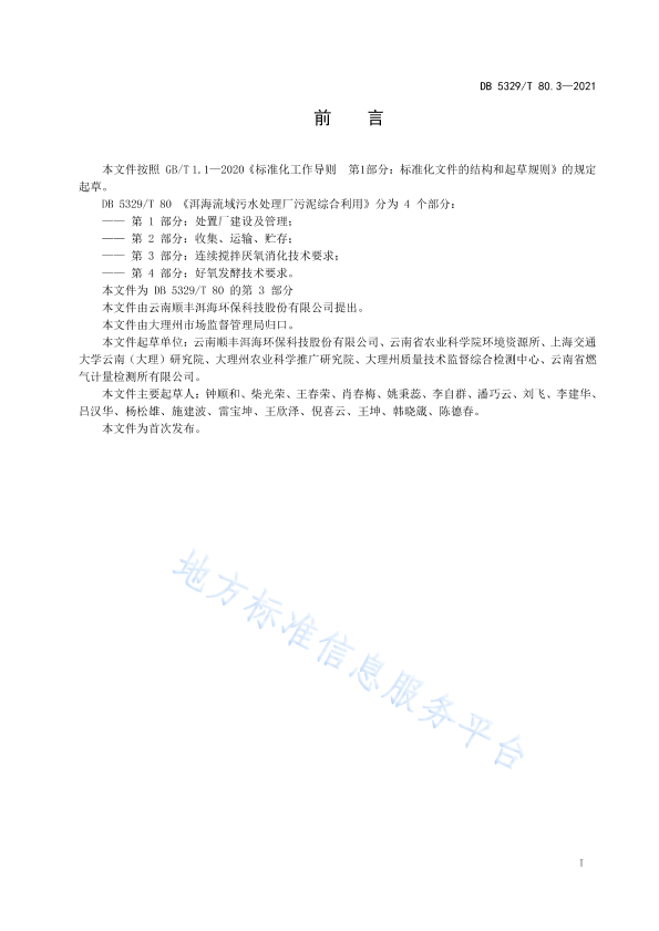 本文件按照GB/T1.1-2020《标准化工作导则 第1部分:标准化文件的结构和起草规则》的规定起草。 DB5329/T80 《洱海流域污水处理厂污泥综合利用》分为4个部分: —— 第1部分:处置厂建设及管理; —— 第2部分:收集、运输、贮存; —— 第3部分:连续搅拌厌氧消化技术要求; —— 第4部分:好氧发酵技术要求。 本文件为DB5329/T80的第3部分 本文件由云南顺丰洱海环保科技股份有限公司提出。 本文件由大理州市场监督管理局归口。 本文件起草单位:云南顺丰洱海环保科技股份有限公司、云南省农业科学院环境资源所、上海交通大学云南(大理)研究院、大理州农业科学推广研究院、大理州质量技术监督综合检测中心、云南省燃气计量检测所有限公司。 本文件主要起草人:钟顺和、柴光荣、王春荣、肖春梅、姚秉蕊、李自群、潘巧云、刘飞、李建华、吕汉华、杨松雄、施建波、雷宝坤、王欣泽、倪喜云、王坤、韩晓箴、陈德春。 本文件为首次发布。