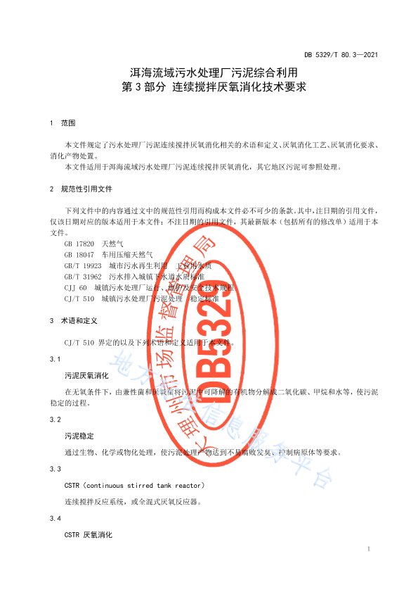 本文件规定了污水处理厂污泥连续搅拌厌氧消化相关的术语和定义、厌氧消化工艺、厌氧消化要求、消化产物处置。 本文件适用于洱海流域污水处理厂污泥连续搅拌厌氧消化,其它地区污泥可参照处理。
