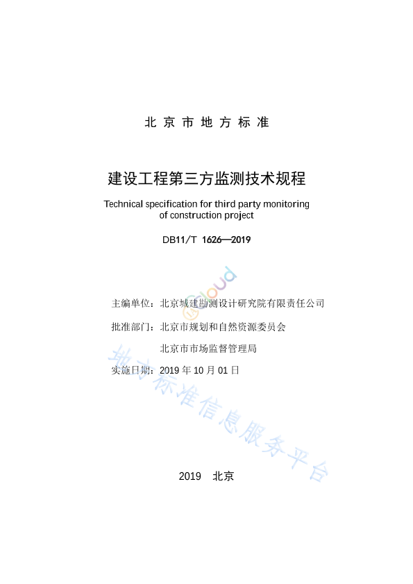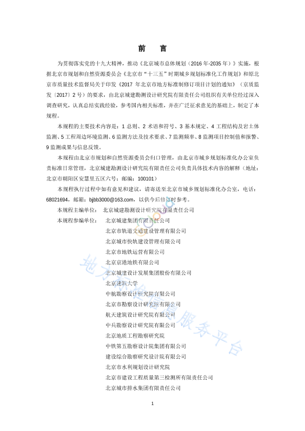 为贯彻落实党的十九大精神,推动《北京城市总体规划(2016年-2035年)》实施,根据北京市规划和自然资源委员会《北京市“十三五”时期城乡规划标准化工作规划》和原北京市质量技术监督局关于印发《2017年北京市地方标准制修订项目计划的通知》(京质监发〔2017〕2号)的要求,由北京城建勘测设计研究院有限责任公司组织有关单位经过深入调查研究,认真总结实践经验,参考国内相关标准,并在广泛征求意见的基础上,制定了本规程。 本规程的主要技术内容是:1总则、2术语和符号、3基本规定、4工程结构及岩土体监测、5工程周边环境监测、6监测方法及技术要求、7监测频率、8监测项目控制值和报警、9监测成果与信息反馈。 本规程由北京市规划和自然资源委员会归口管理,由北京市城乡规划标准化办公室负责标准日常管理,北京城建勘测设计研究院有限责任公司负责具体技术内容的解释(地址:北京市朝阳区安慧里五区六号;邮编:100101) 本规程执行过程中如有意见和建议,请寄送至北京市城乡规划标准化办公室,电话:68021694,邮箱:bjbb3000@163.com,以供今后修订时参考。 本规程主编单位:北京城建勘测设计研究院有限责任公司 本规程参编单位:北京城建集团有限责任公司、北京市轨道交通建设管理有限公司 、北京城市快轨建设管理有限公司 、北京市地铁运营有限公司、北京京港地铁有限公司 、北京城建设计发展集团股份有限公司 、北京建筑大学 、中航勘察设计研究院有限公司 、北京市勘察设计研究院有限公司、航天建筑设计研究院有限公司 、中兵勘察设计研究院有限公司 、北京地质工程勘察研究院 、中铁第五勘察设计院集团有限公司 、建设综合勘察研究设计院有限公司 、北京市水利规划设计研究院 、北京市建设工程质量第三检测所有限责任公司、北京城市排水集团有限责任公司、北京市首都公路发展集团有限公司、北京市绿化隔离地区基础设施开发建设有限公司、北京中天路通工程勘测有限公司 本规程主要起草人员:张建全 马海志 张晋勋 王思锴 曹宝宁 任干 王笃礼 曹伍富 周继波 刘军 郭密文 白朝旭 刘洪臣 刘智强 温向东 白唐瀛 石俊成 贺美德 程凌鹏 苏强 龚洁英 姚爱敏 闫宇蕾 郝庆斌 涂晓明 张振营 马雪梅 刘永勤 李芳凝 张勇欣 立庆 姜宏维 张文强 吕方泉 张军 谢志杰 刘烁 关旭 李承鹏 本规程主要审查人员:贺长俊 金淮 杨伯钢 化建新 周与诚 鲁屹 贺少辉